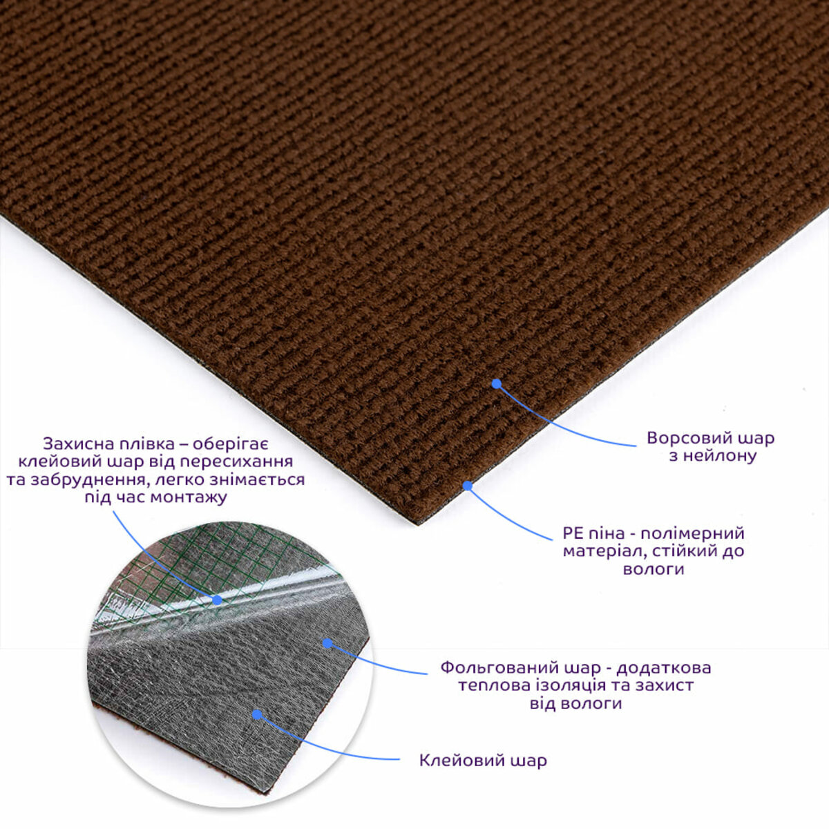 • Захисна плівка: зберігає клейовий шар від пересихання та забруднення, легко знімається під час монтажу.