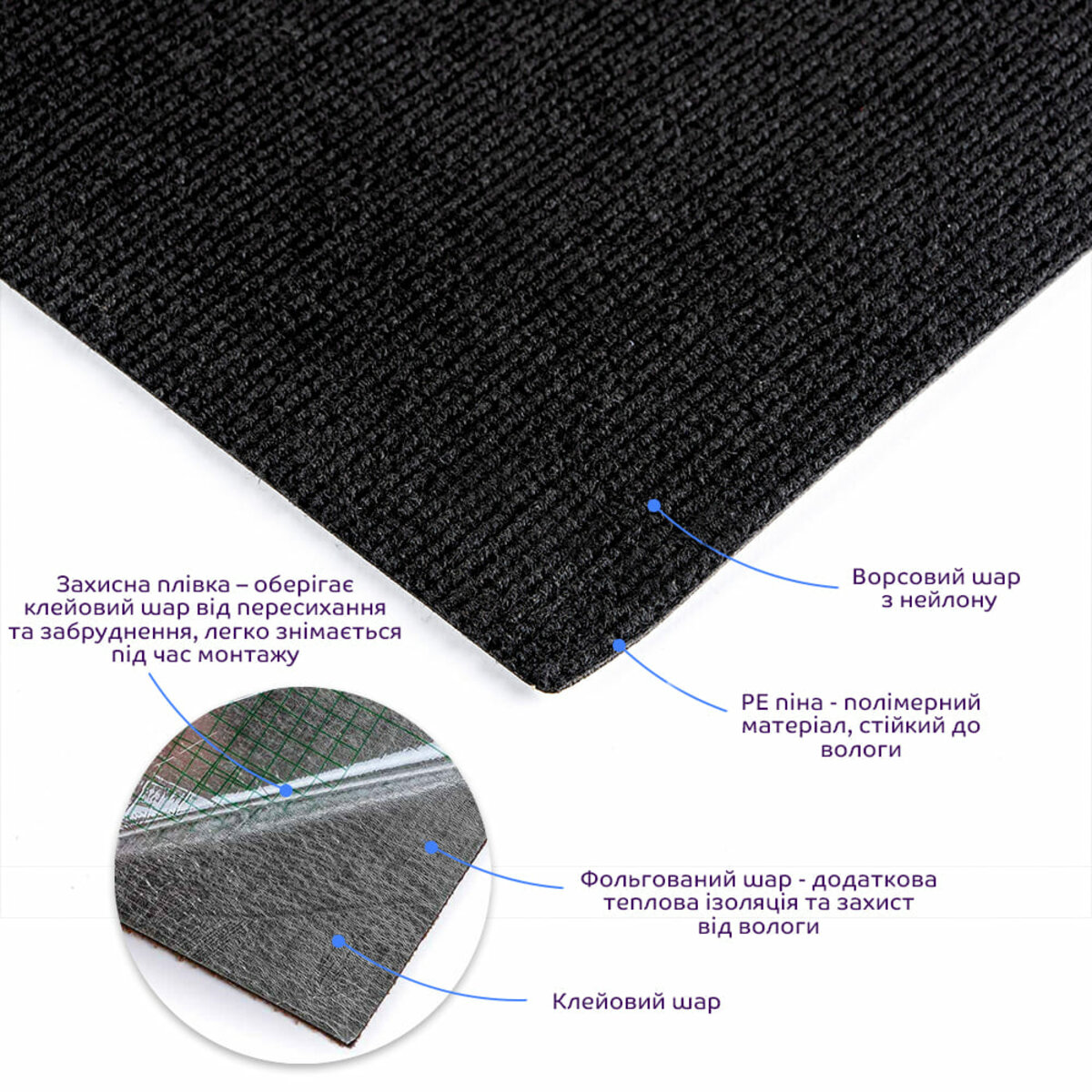 • Захисна плівка: зберігає клейовий шар від пересихання та забруднення, легко знімається під час монтажу.