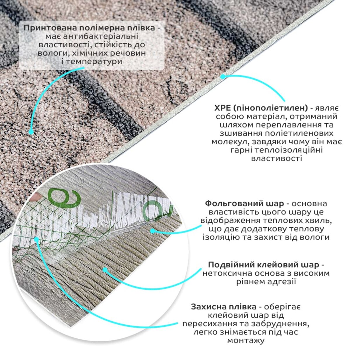 - Захисна плівка: оберігає клейовий шар від пересихання та забруднення, легко знімається під час монтажу.