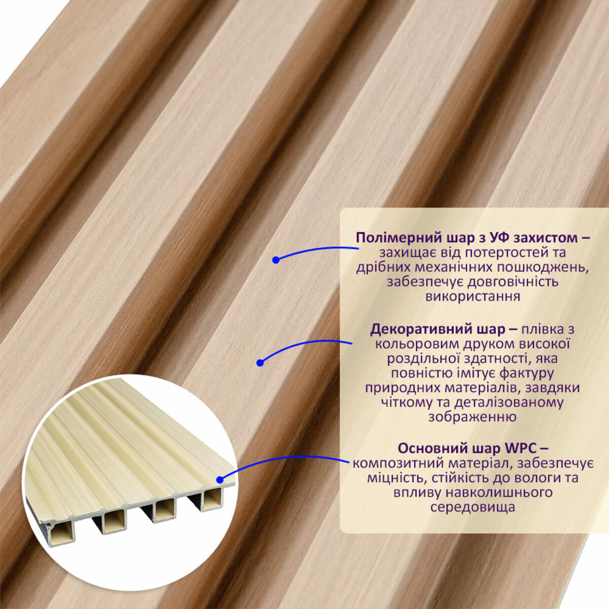 Опис: Стінові рейки WPC – будівельний матеріал для внутрішнього оздоблення, що імітує натуральну деревину.