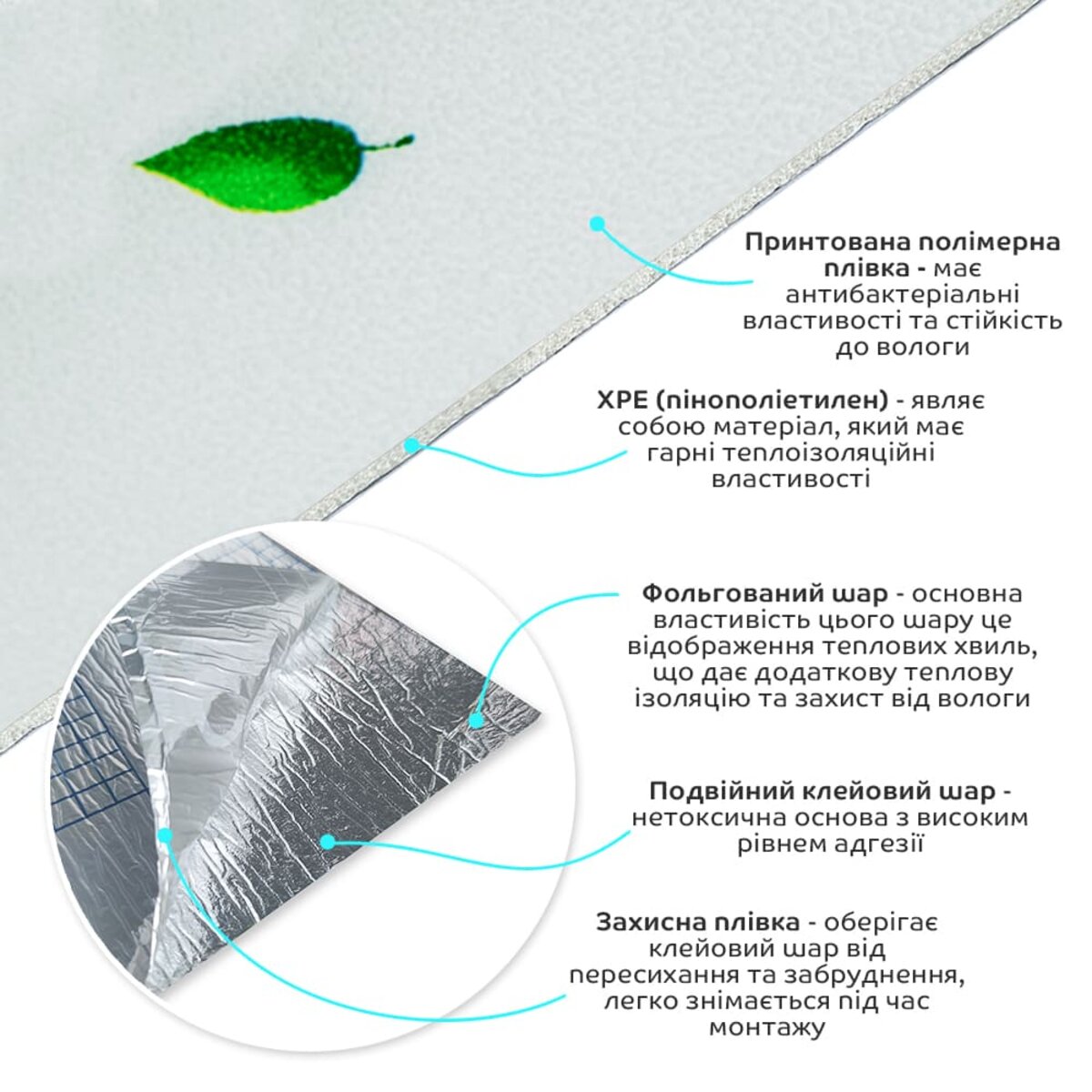 - Теплоізоляція: Спінений ХРЕ і фольгований шар забезпечують хорошу теплоізоляцію, що допомагає підтримувати комфортну температуру в приміщенні.