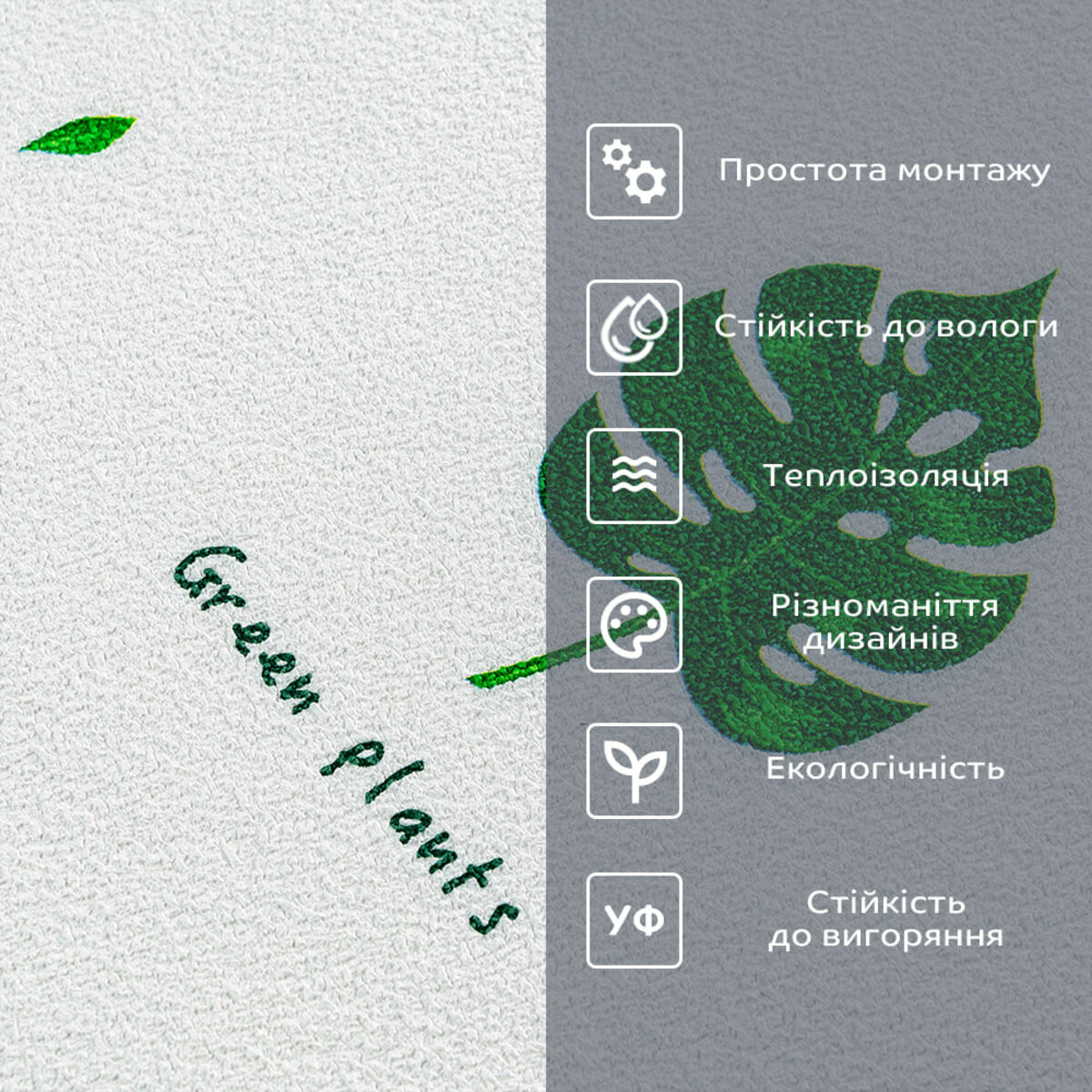 - Прінтована полімерна плівка - має антибактеріальні властивості, стійкість до вологи, хімічних речовин і температури. -захист допомагає запобігти вигоранню, зберігаючи колір насиченим, за рахунок чого шпалери довго зберігають свій первісний естетичний вигляд