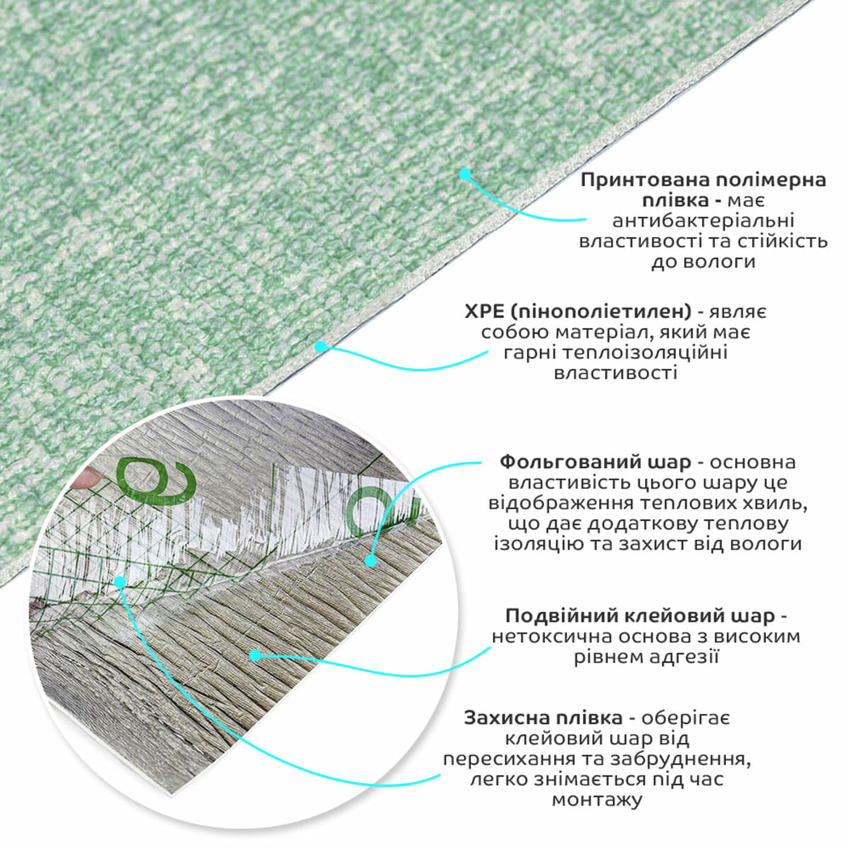 - Теплоізоляція: Спінений ХРЕ і фольгований шар забезпечують хорошу теплоізоляцію, що допомагає підтримувати комфортну температуру в приміщенні.