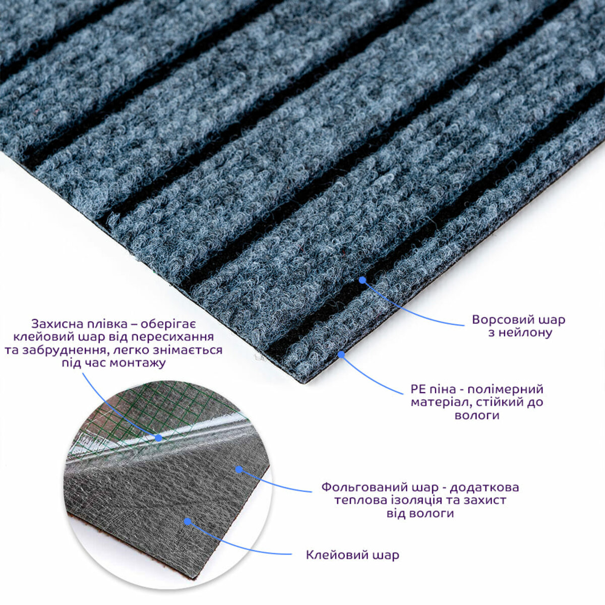 • Захисна плівка: зберігає клейовий шар від пересихання та забруднення, легко знімається під час монтажу.
